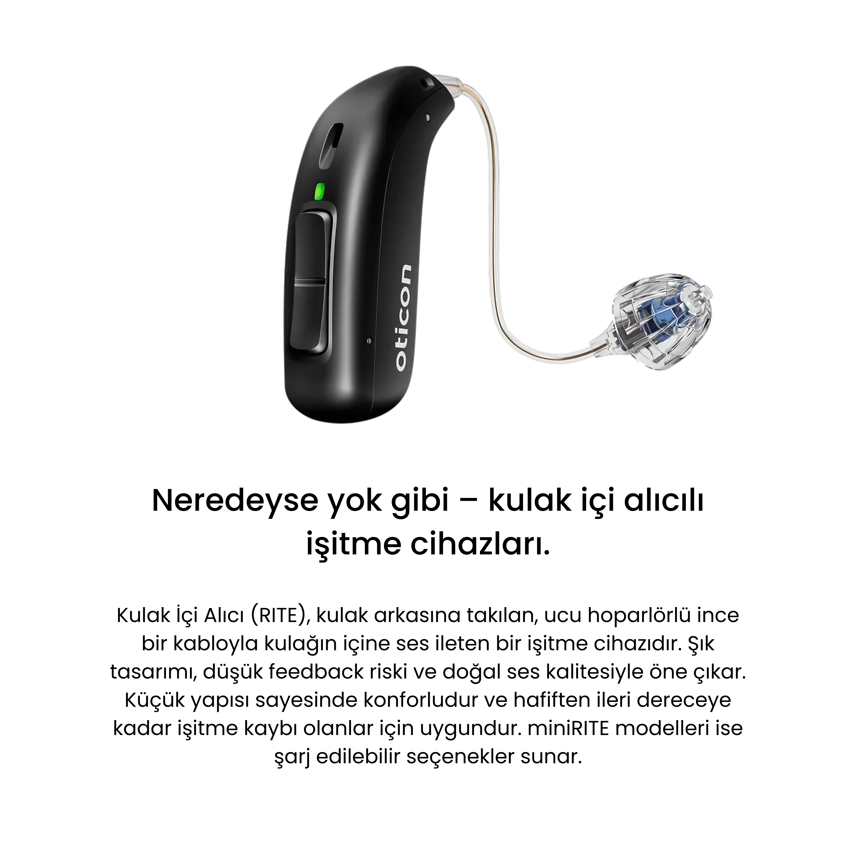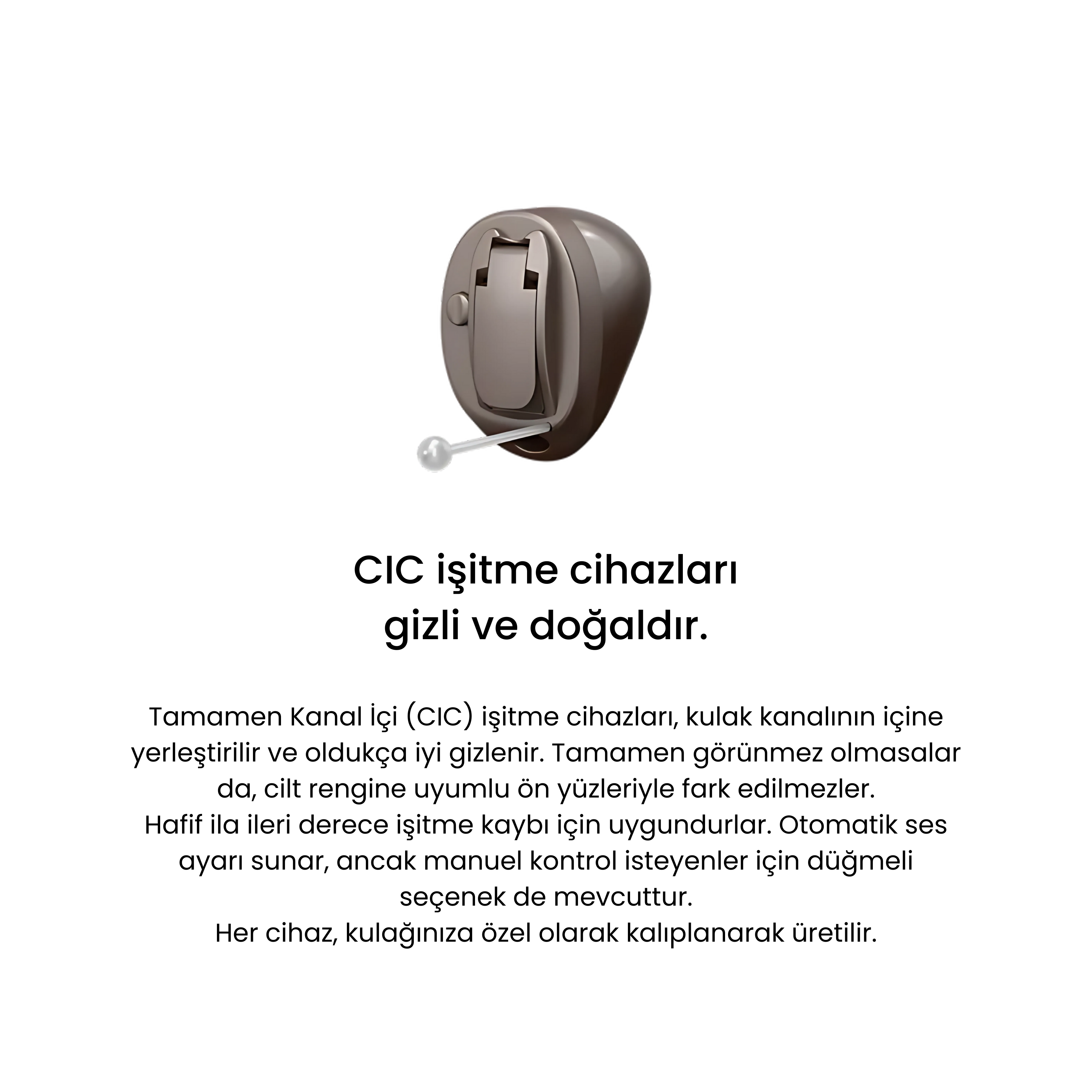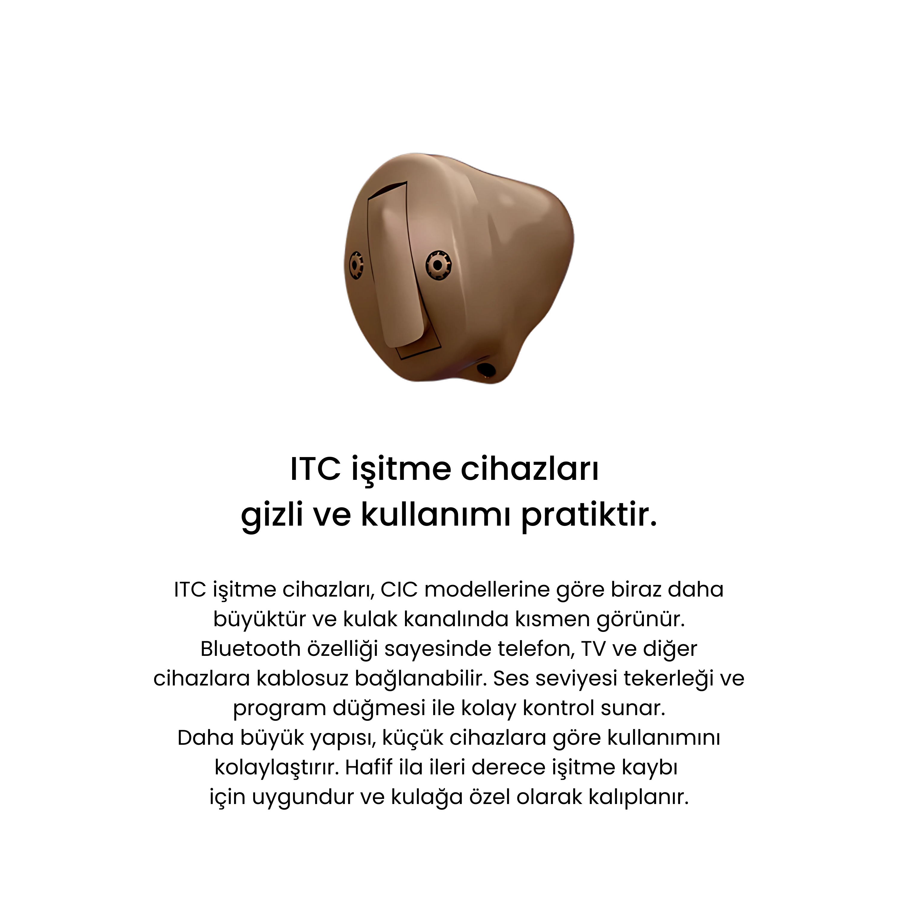 Kulak içi işitme cihazları, gözlük, şapka veya başa takılan diğer aksesuarlarla çakışmadan, kulak kanalına konforlu bir şekilde yerleştirilebilir. En küçük modelleri tamamen görünmezken, daha büyük olanlar cilt tonuyla uyum sağlayacak şekilde tasarlanmıştır.